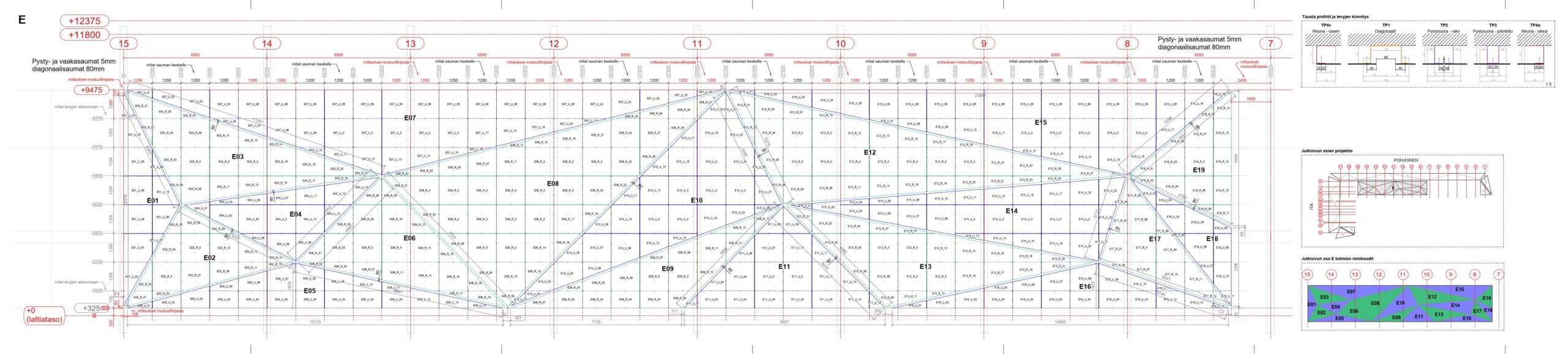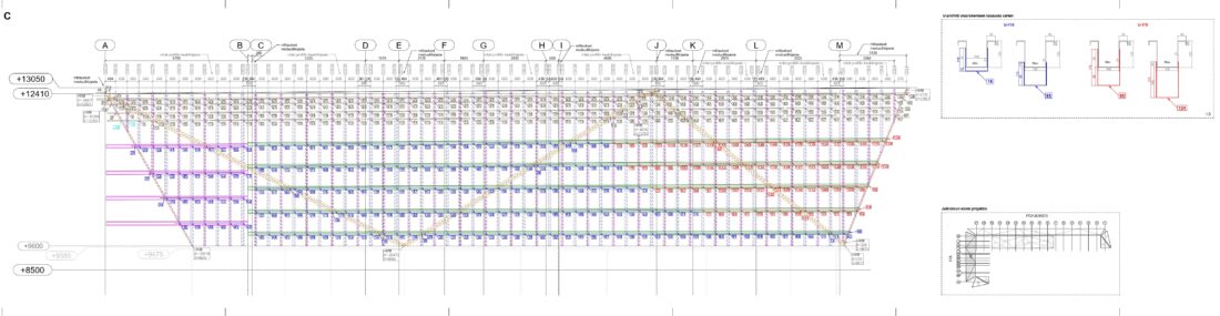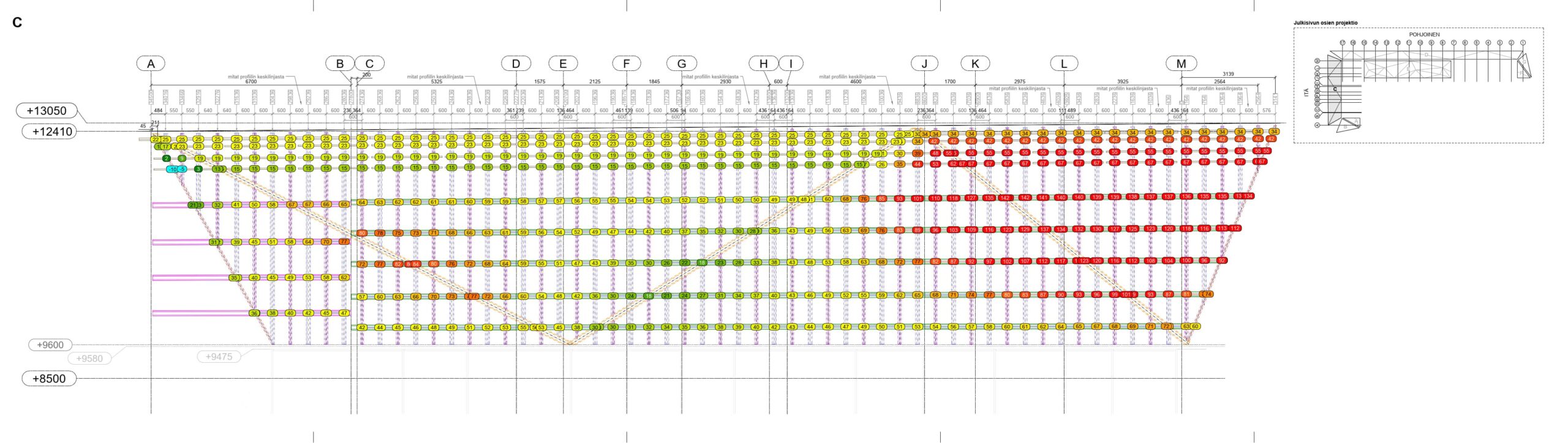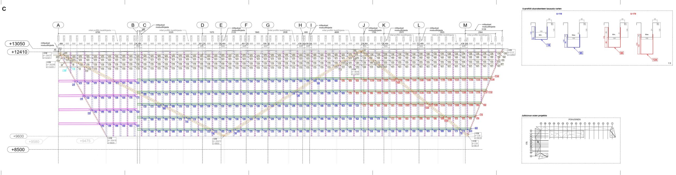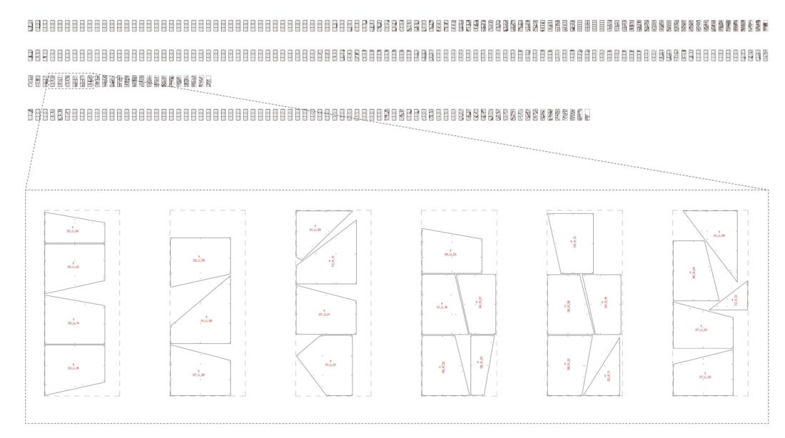 To reduce material waste, we created a nesting strategy that fit these panels efficiently into 1500×3700 mm aluminium sheets during fabrication. We also planned the installation of both the façade panels and the back-structure, which used four different beam profile types for proper structural support and efficient installation.